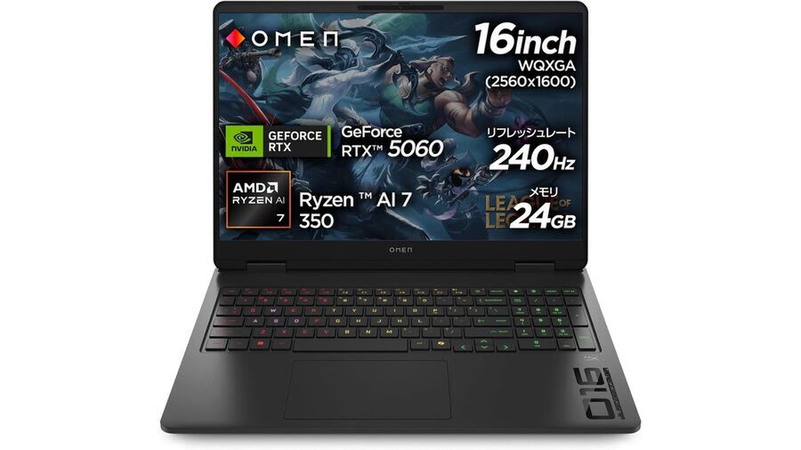 本製品は、AMD「Ryzen AI 7 350」とNVIDIA「GeForce RTX 5060 Laptop GPU」を搭載する16型ゲーミングノートPC。メモリーは24GB(12GB×2、DDR5-5600)、ストレージは1TB M.2 SSD、解像度はWQXGA(2560×1600ドット)、リフレッシュレートは240Hz、OSはWindows 11 Homeなどとなっている。