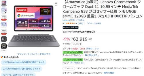Lenovoの10.95インチChromebook「Duet 11(83HH000TJP)」がAmazonで割引対象。参考価格6万9300円のところ、9%オフの6万2919円で販売中。