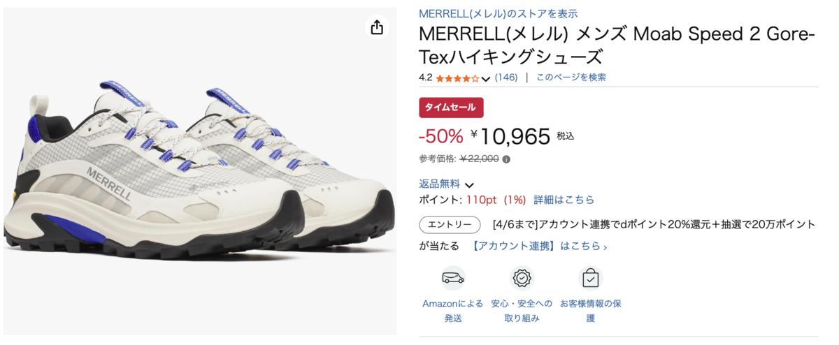 MERRELLのMoab Speed 2 Gore-Texハイキングシューズが、現在Amazonにて50%OFFの10,965円で販売されています!