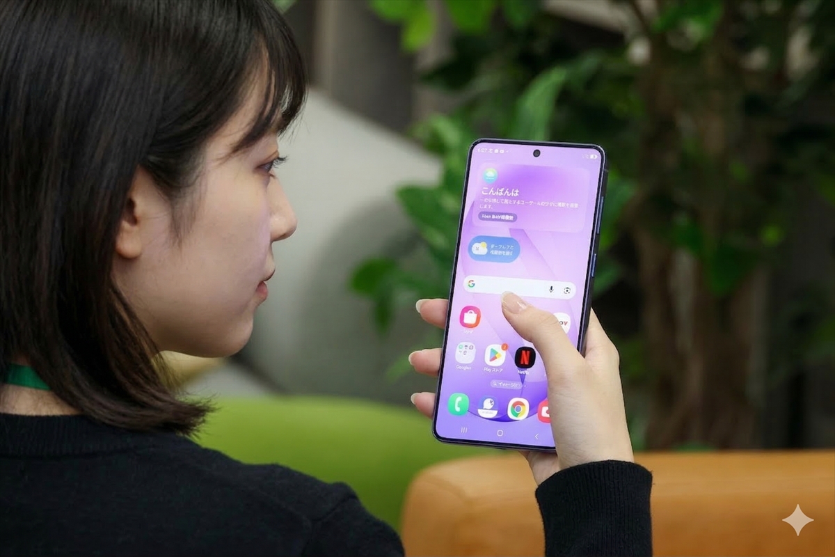 「Galaxy S26+」は、ハイエンドに位置するスマホです。6.7型の大画面を搭載し、動画視聴やウェブ閲覧を広々と快適に楽しめます。最大の特徴は、ユーザーの予定やメールから行動を読み取り、先回りして日常をサポートしてくれる賢いAI機能です。
