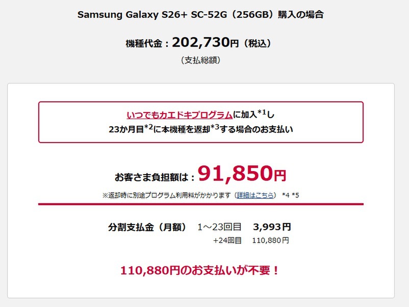 これだけの画面サイズと最新の基本性能を備えたハイエンド機でありながら、通信キャリアの端末購入プログラムなどを活用することで、比較的お手頃な価格帯で入手できるのもうれしいポイントです。たとえばドコモでの価格は新規一括で20万2730円ですが、いつでもカエドキプログラムに加入し、23ヵ月目に本体を返却すれば9万1850円です(別途プログラム利用料2万2000円が必要な場合があります)。