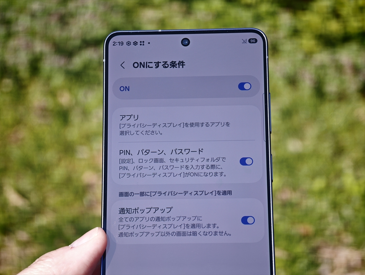 この機能のおかげで、横からは画面がほぼ見えなくなるため、満員電車の中でもLINEの返信をしたり、プライベートな写真を見たりするときにも安心です。アクセサリーの「のぞき見防止フィルム」との違いはディスプレー自体の発光を調整しているので、全画面だけでなく、通知ポップアップやパスワード入力欄だけを隠したりできること。