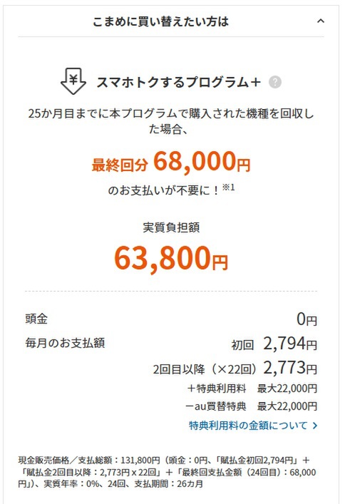 またauで取り扱っているので、割引プラン(スマホトクするプログラム+)が使えるため、2年後に返却するという条件付きですが、実質負担額が6万3800円で買えるのも見逃せません。