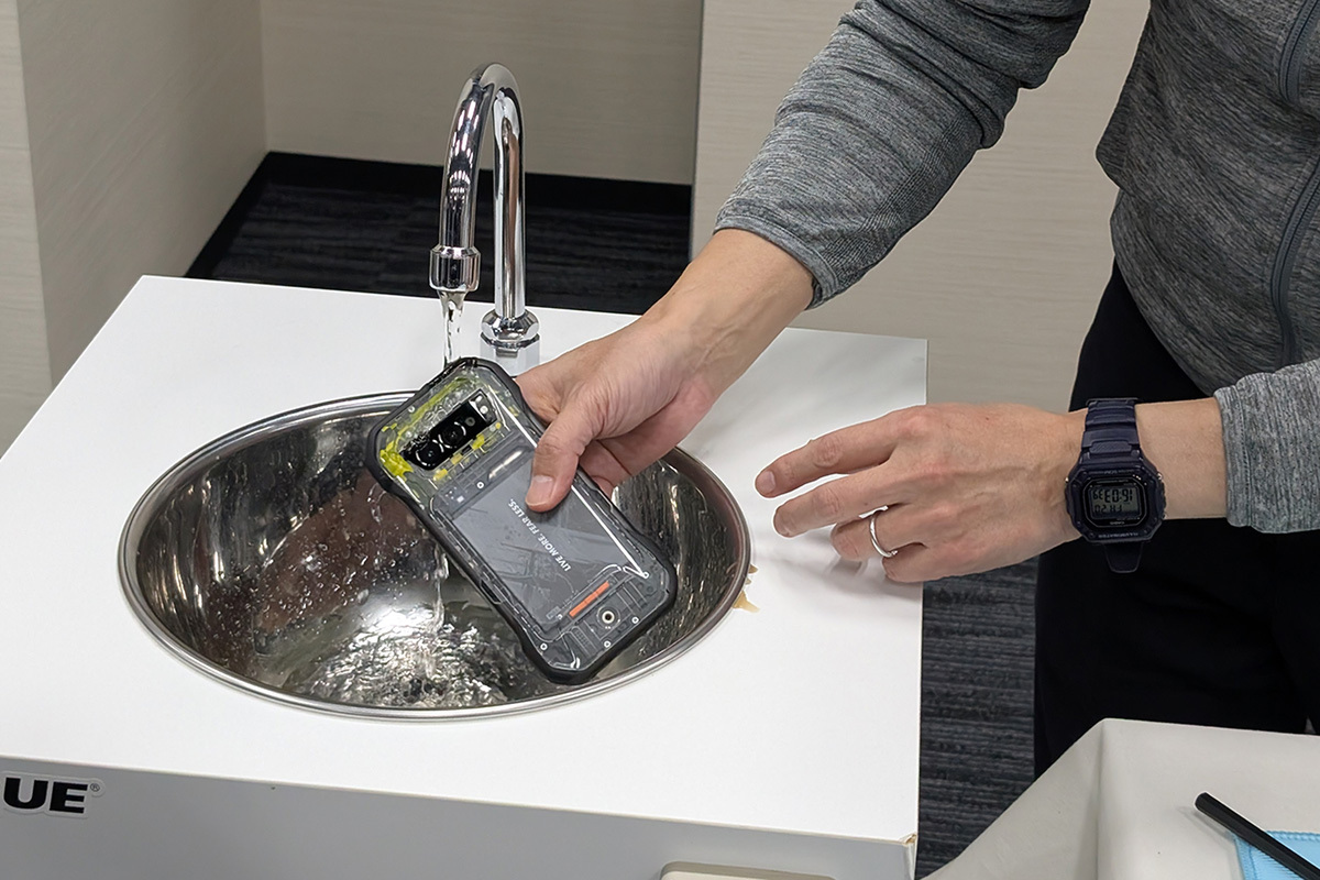 なんと、泥水の中に落としてしまっても、そのまま水でジャブジャブと洗い流すことができます。普通のスマホなら一発で壊れてしまうような泥や砂だらけの状況でも、まったく気にせず使えるのは驚きです。