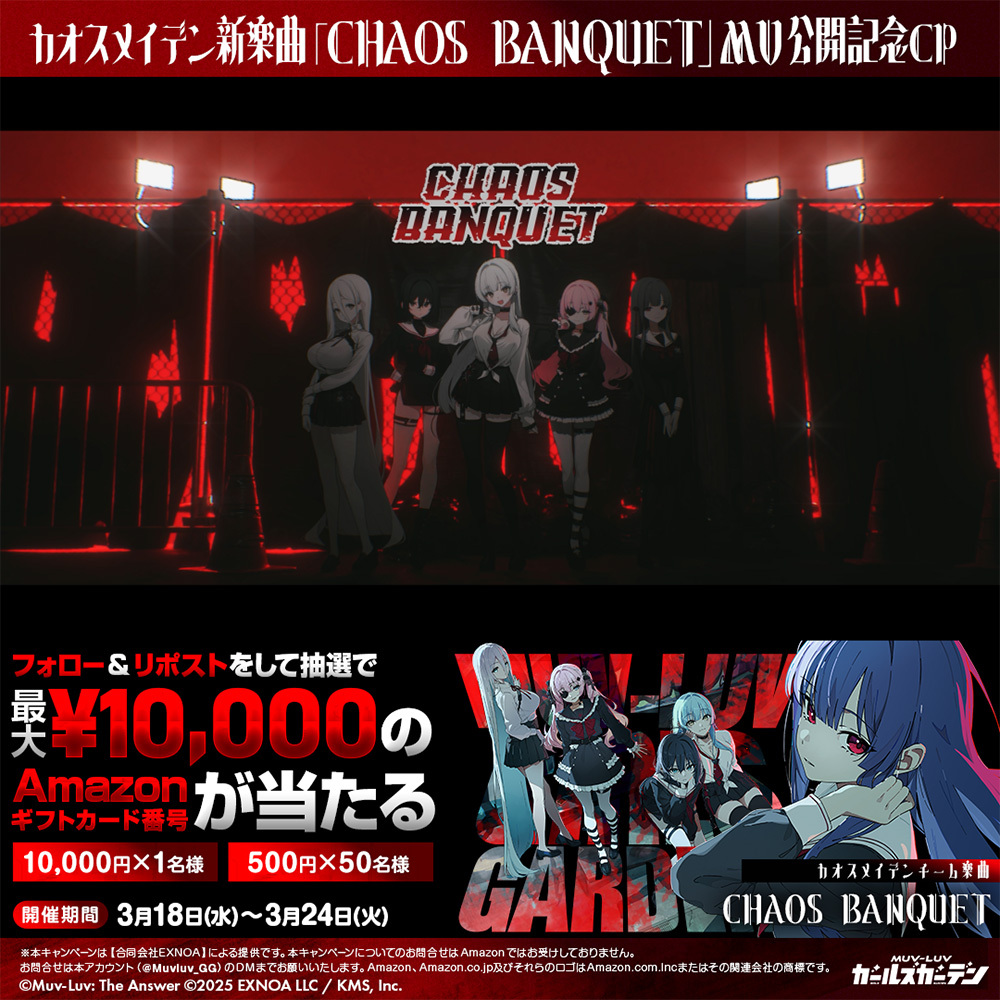 マブガル公式X(@Muvluv_GG)では、チーム「カオスメイデン」新楽曲「CHAOS BANQUET」のMVを記念して、最大1万円分のAmazonギフトカード番号が抽選で当たるキャンペーンを開催中。ぜひ公式Xをフォローしてキャンペーンに参加してみてはいかがだろうか。開催期間は、2026年3月18日19時30分~3月24日23時59分まで。