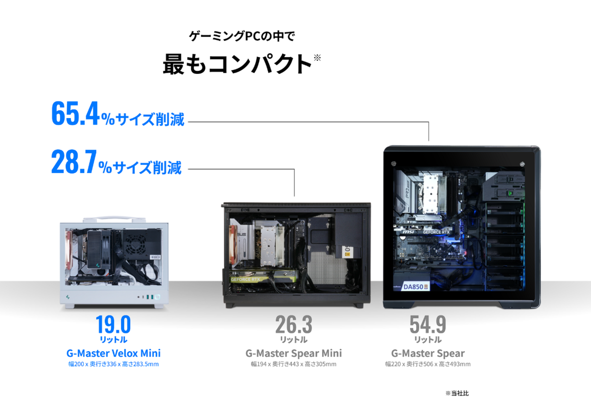 この人気シリーズの小型モデルとして誕生したシリーズが「G-Master Velox Mini」だ。サイズは200(W)×336(D)×283.5(H)mm、容積わずか19Lというコンパクトボディーに、ミドルタワーPCに匹敵するほどのゲーミング性能を秘めている点が魅力だ。