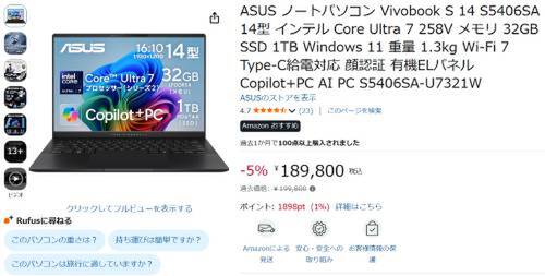 ASUSの14型ノート「Vivobook S 14(S5406SA-U7321W)」がAmazonタイムセール対象。過去価格199,800円のところ、5%オフの189,800円で販売中。