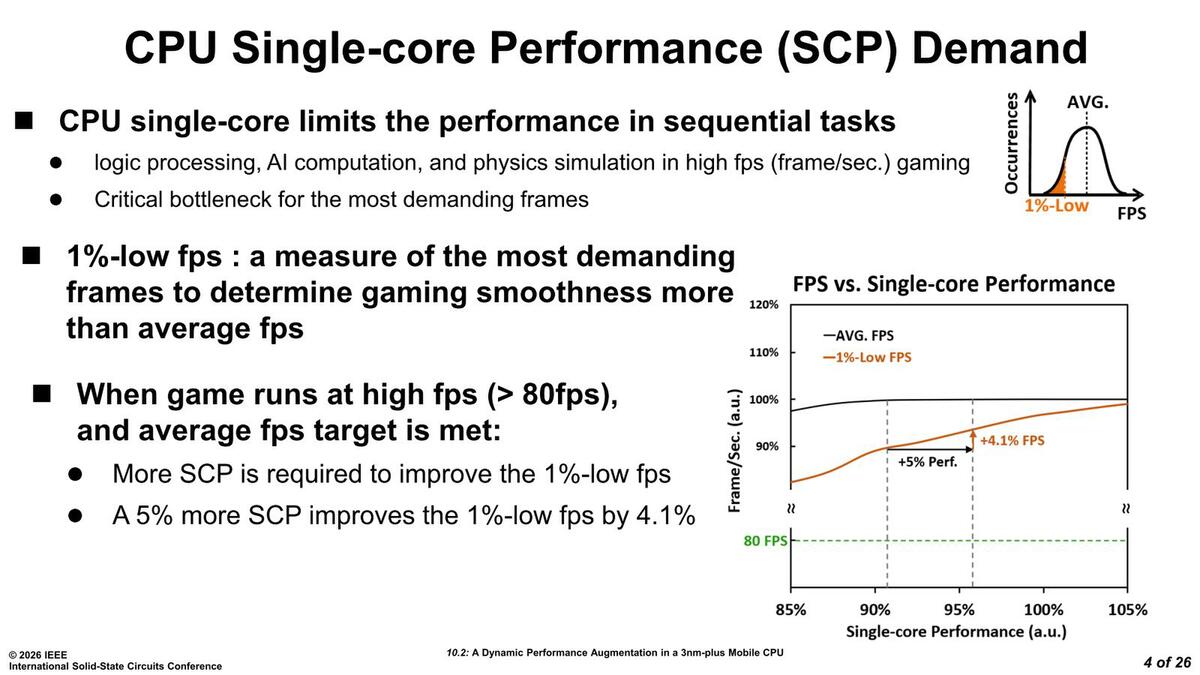 平均フレームレートから1%低い値というのが、おおむね9割近いフレームレートをカバーする範囲になる。これを80fps以上に引き上げるのが目的であり、SCP(Single Core Performance)を5%引き上げるとこの1%-Low fpsが4.1%向上するとしている