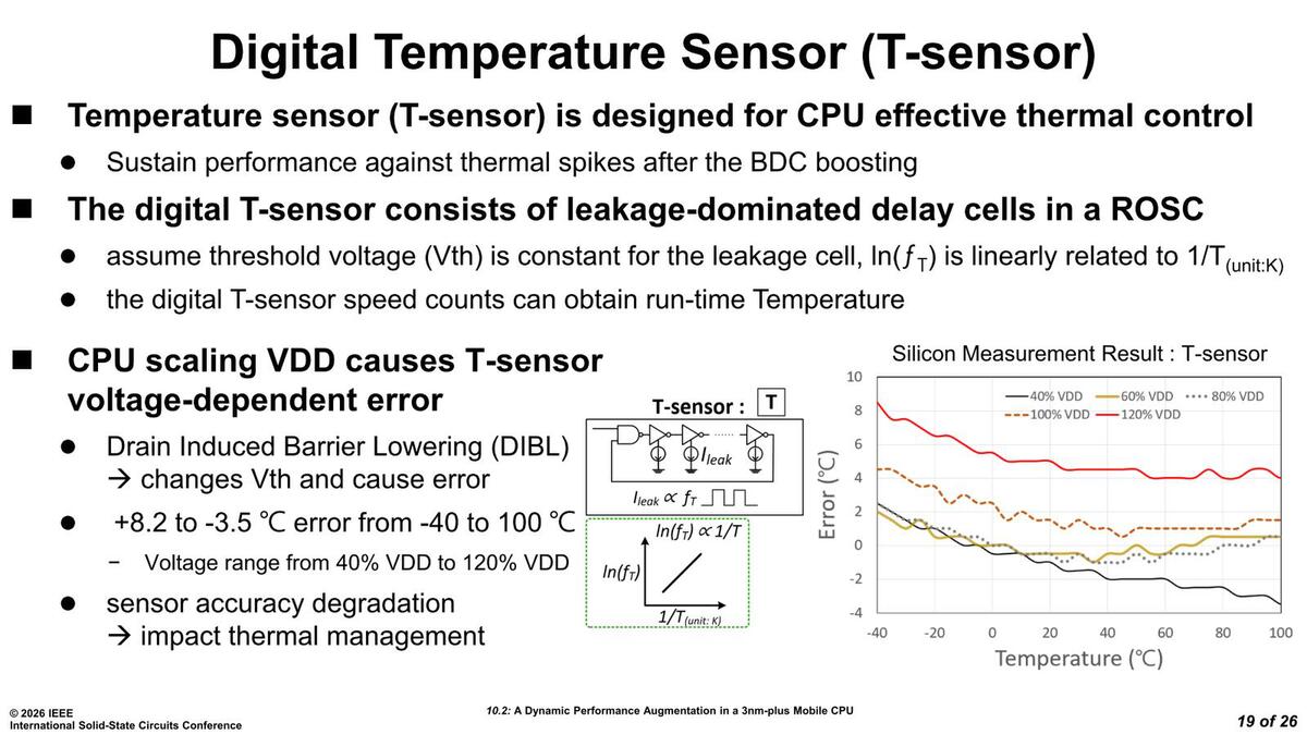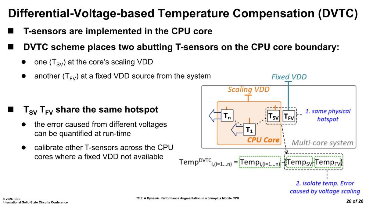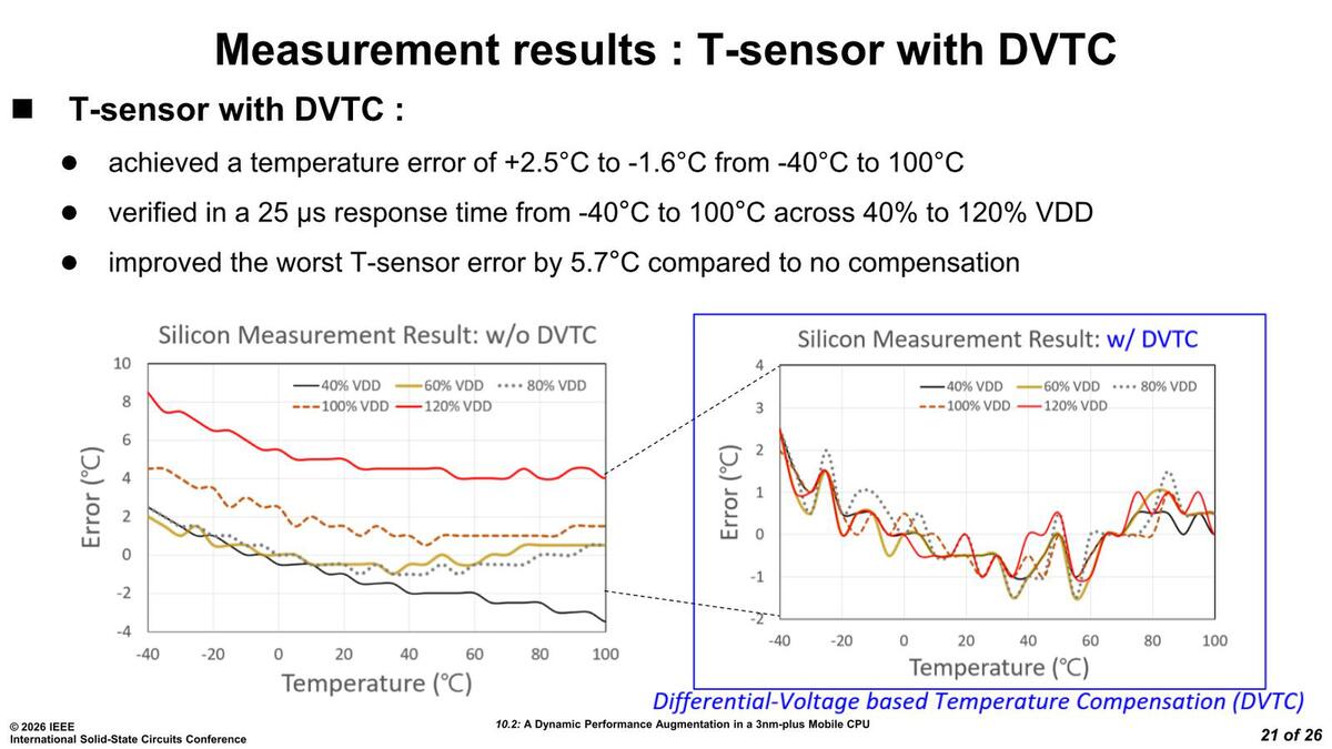 右グラフは実際の温度とT-Sensorが検知した温度の差であるが、電圧が低い時は低め、電圧が上がると高めになり、誤差は-3.5~8.2度と結構大きい。これはDIBL(ドレイン誘起障壁低下)に起因するものである。そこでDimensiton 9500ではDVTCという仕組みを導入した。