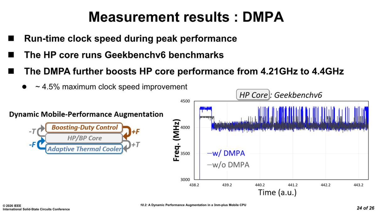実際にこのDMPAを使った場合の動作周波数の変動というのが下の画像で、平均して4.5%ほど実効動作周波数を引き上げられたとする。