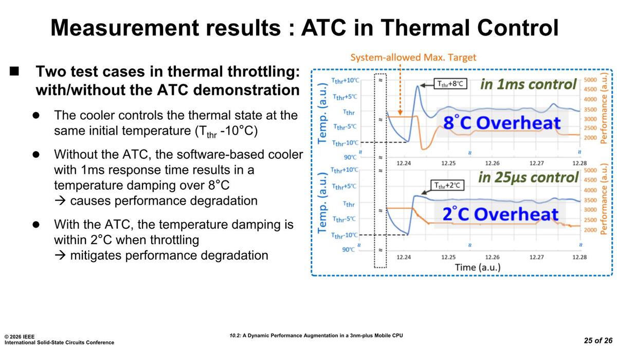 右下にあるが、BDCは基本的に周波数を上げる(ので温度が上がる)制御で、ATCは周波数を下げる(ので温度が下がる)制御となる。この2つのコントローラーが常に動作周波数と電圧を調整することで、ちょうど手頃な動作周波数を実現できる、というものだ。