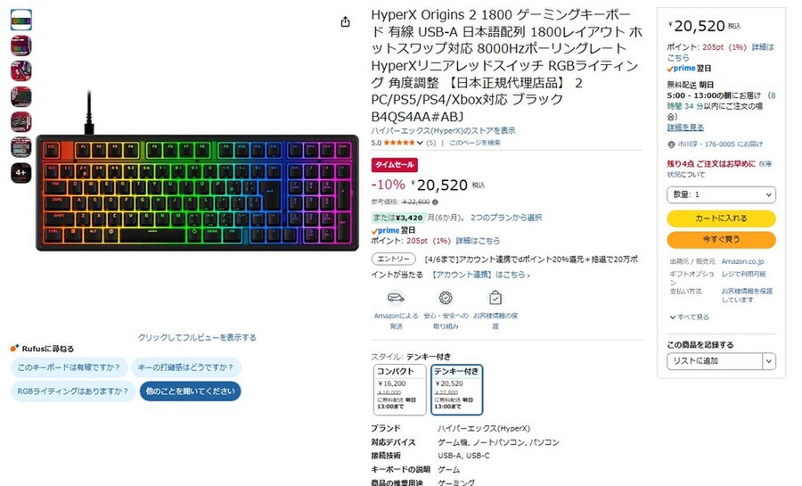 Amazon.co.jpにて、HyperXのゲーミングキーボード「HyperX Origins 2 1800(テンキー付き)」が販売中だ。参考価格は2万2800円だが、タイムセールにより10%オフの2万520円で購入できる(3月19日時点)。