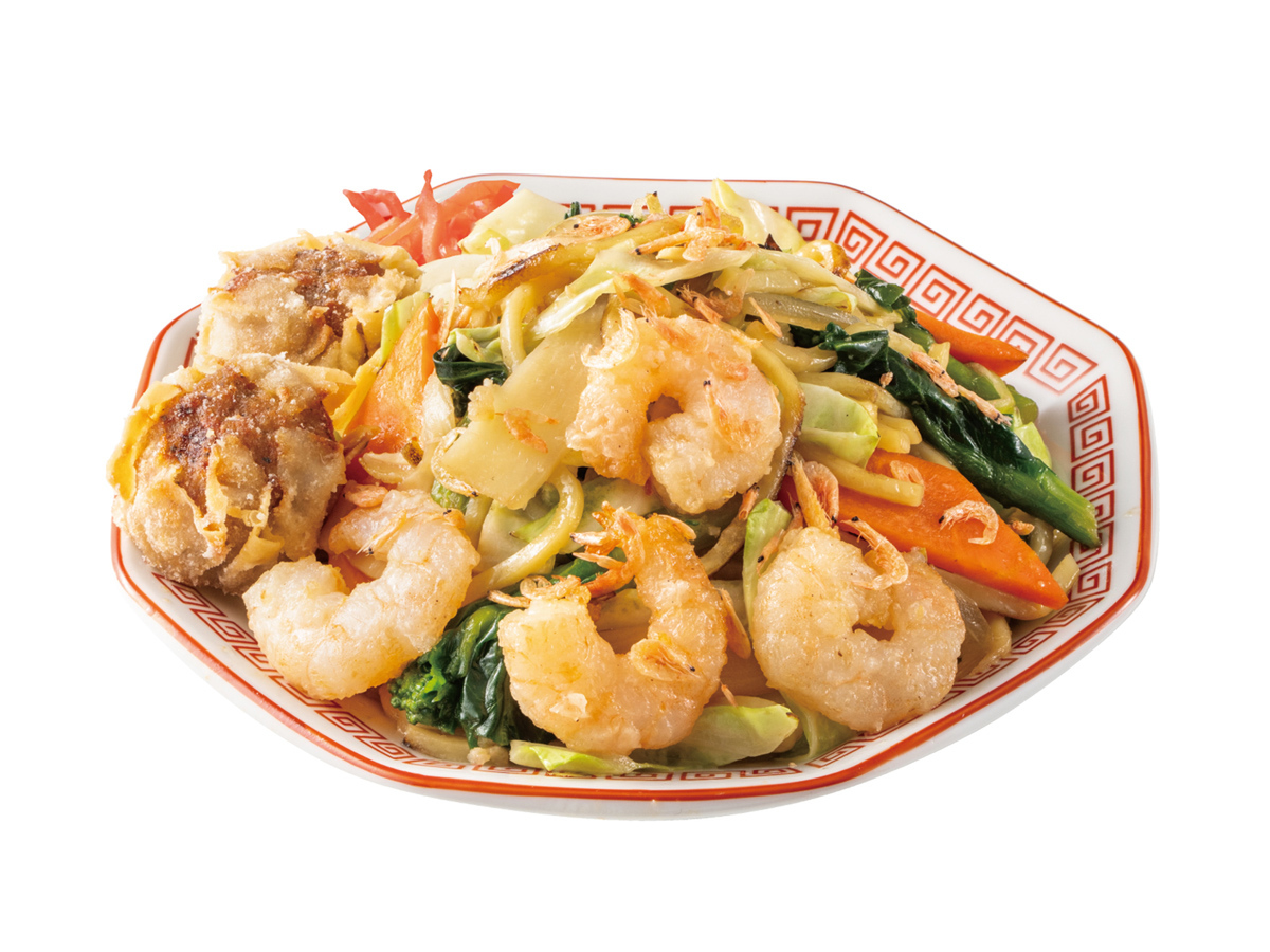 強火で焼き上げた太麺に、海老と揚げ焼売をトッピングした麺メニュー「弾けっぷりプリ海老ガーリック焼きそば」が登場。