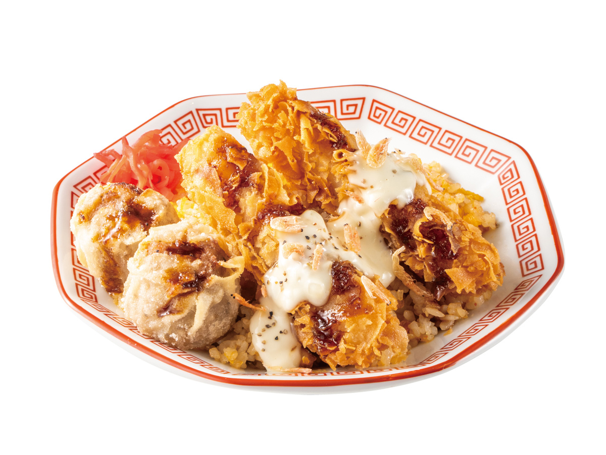 また、海老チャーハンの上に、揚げた海老スティックと揚げ焼売をのせた「心躍る弾むザックザク海老チャーハン」も登場。