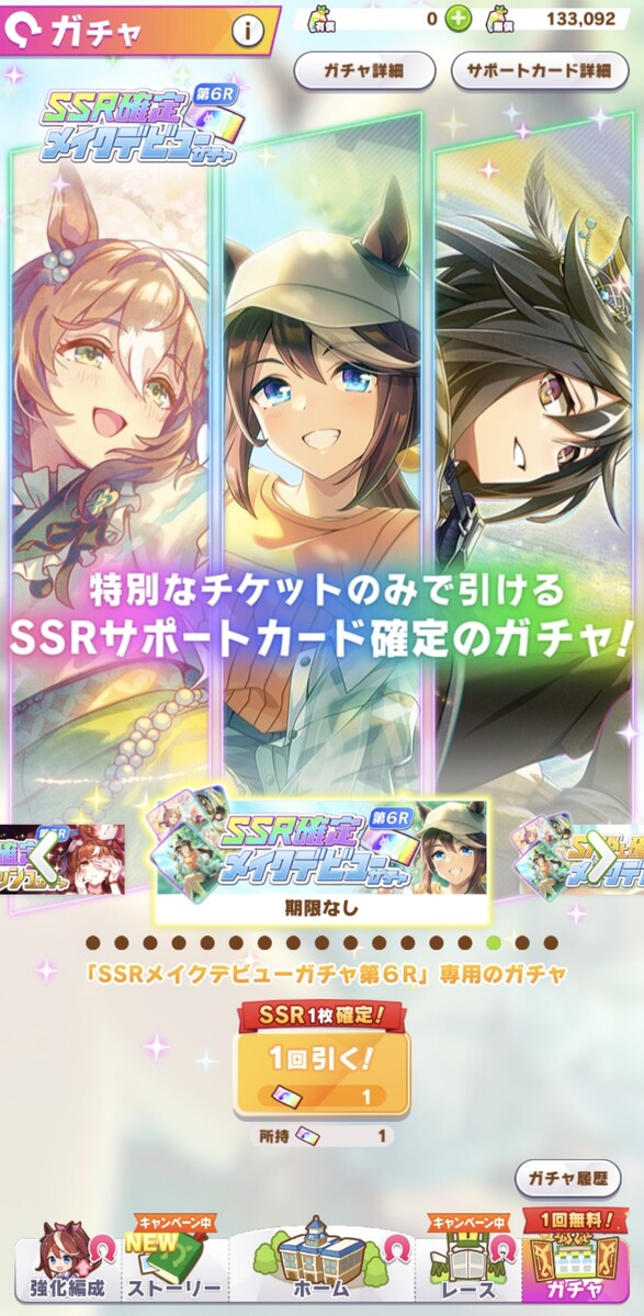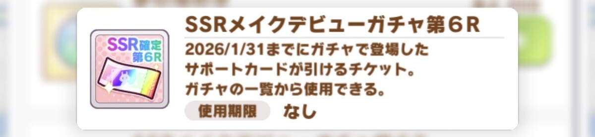 それを記念して、2026年4月19日23時59分までにゲームを開始したトレーナーを対象として、「SSRメイクデビューガチャ第6R」をプレゼントしている。これは2026年1月31日までに登場したSSRサポートカードが確定で出現するガチャチケットだ。ホーム画面の「プレゼント」から忘れずにゲットしておこう。
