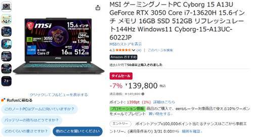 MSIの15.6型ゲーミングノート「Cyborg 15 A13U」がAmazonタイムセール対象。過去価格149,800円のところ、7%オフの139,800円で販売中。