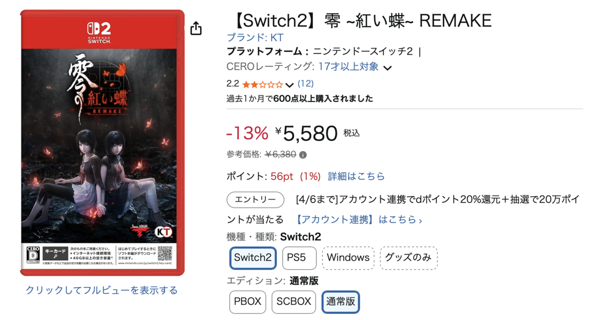 恐怖だけではなく、「零」シリーズの作り出す美しい世界観にも注目してほしいです。とはいえ、初代Xboxでプレイしてもらうのはハードルが高いと思っていたところ、3月12日に「零 ~紅い蝶~ REMAKE」が登場しました。Switch 2版はAmazonでの参考価格は6,380円ですが、13%オフの5,580円で購入できます(3月19日現在)。