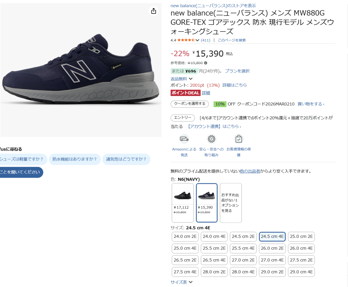 雨の日の歩行を意識した仕様が魅力ですが、サイズや幅の選び方で印象が変わりやすい商品でもあります。購入時は2Eか4Eかを確認し、普段の使用シーンに合ったカラーを選ぶのがおすすめです。価格やポイント還元、クーポン適用条件は変動するため、注文前に販売ページを確認しておくと安心です。
