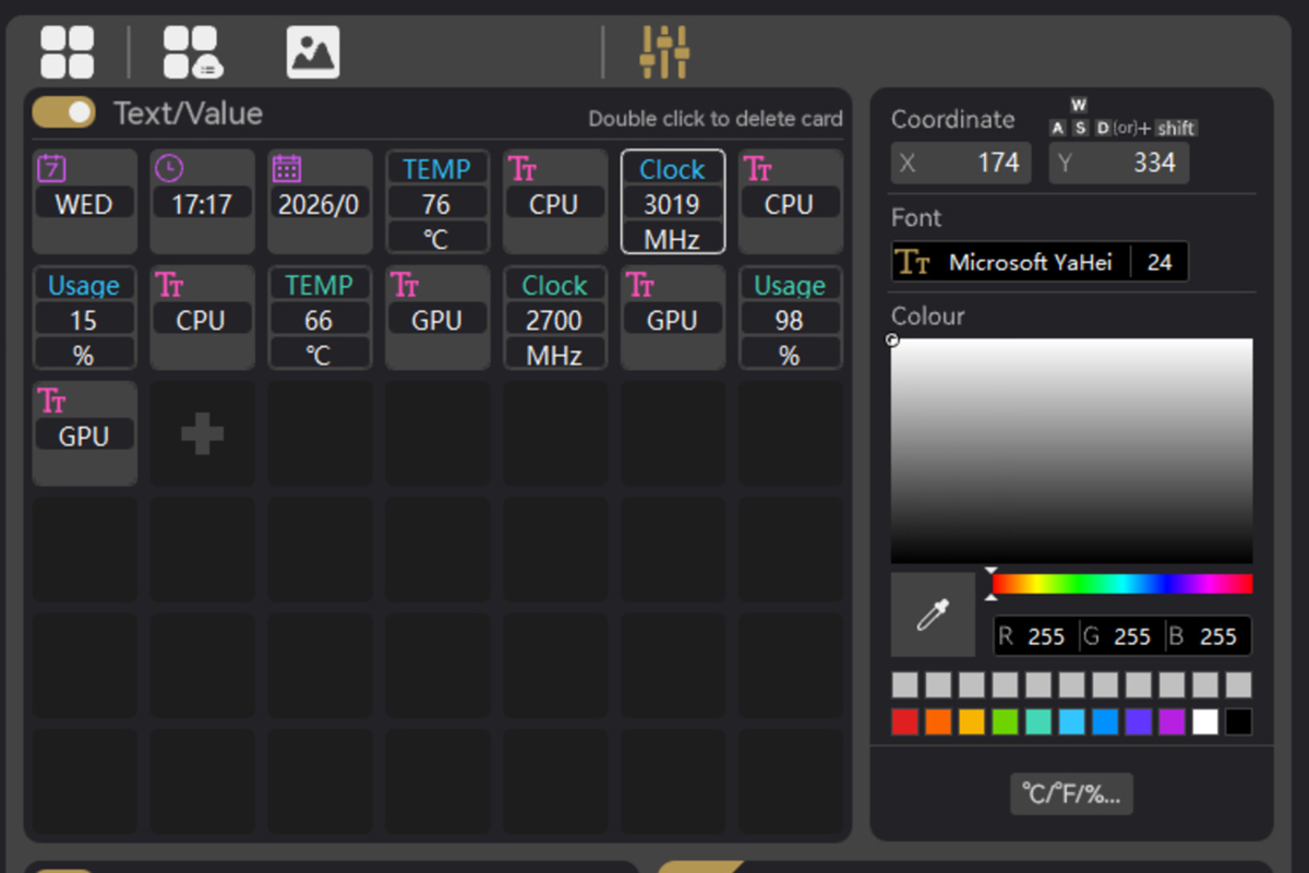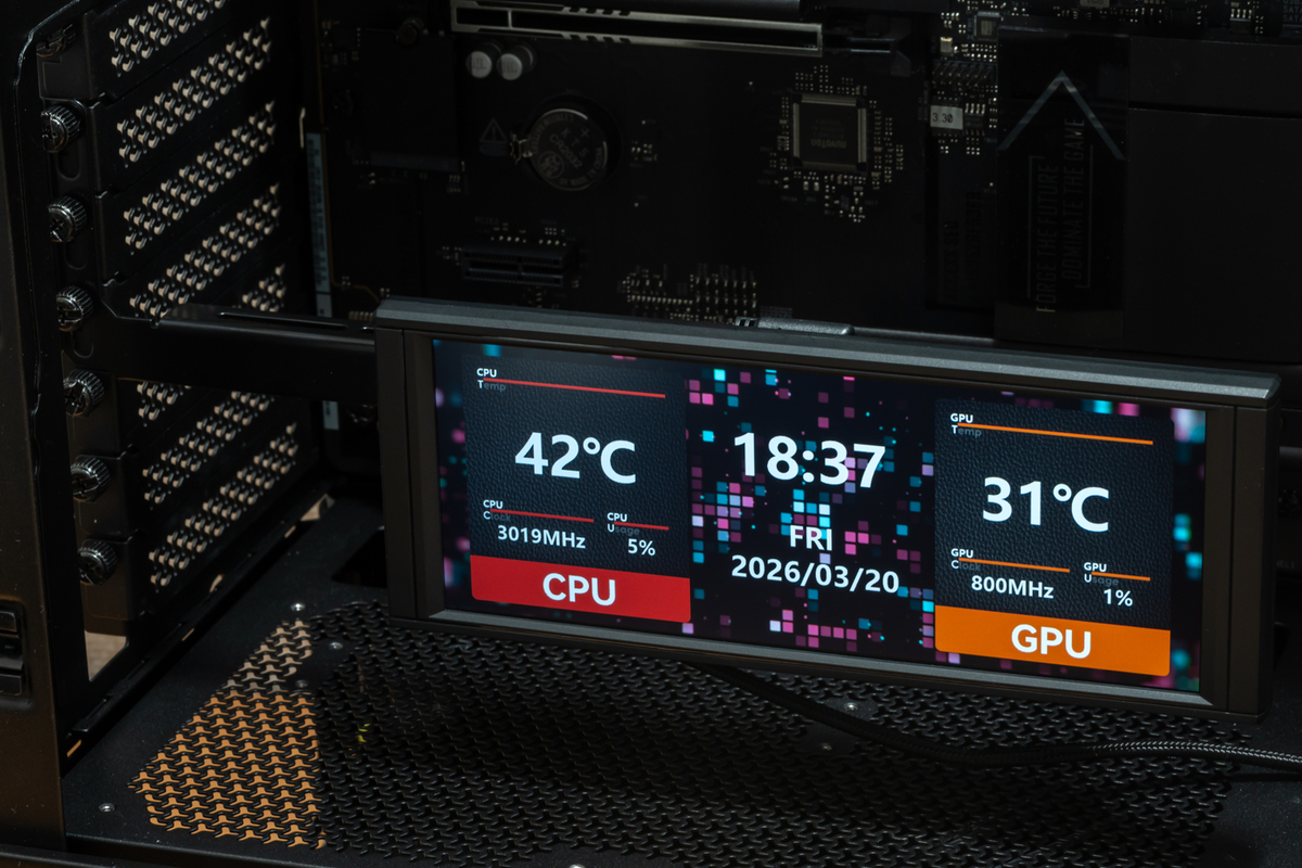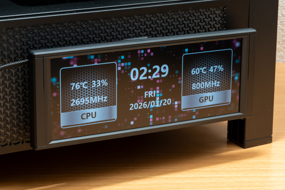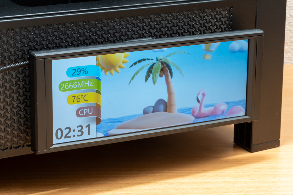 プリセットをベースに表示するステータスの情報や表示文字、色など細かくカスタマイズできるのもうれしいところ。デフォルトの”CPU”や”GPU”を、実際に搭載しているCPUとGPUの型番に変更したり、文字色などを製品ブランドの色にしたりできる。6500円前後ながら、ステータスモニターの楽しみを十分に味わえるのは、かなり高評価だ。