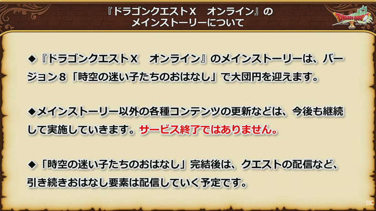 スクウェア・エニックスは3月21日、MMORPG「ドラゴンクエストX オンライン」のメインストーリーをバージョン8「時空の迷い子たち」で完結させると発表した。