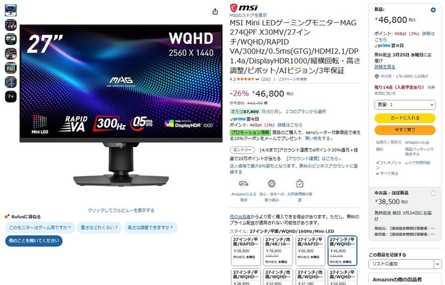 本製品は、WQHD(2560×1440ドット)に対応する27型ゲーミングディスプレー。パネル方式はRapid VA(Mini LED)、表面タイプはノングレア、最大リフレッシュレートは300Hz、応答速度は0.5ms(GTG)、DisplayHDR1000、多機能スタンドなどが特徴だ。現時点だと4万円台で買えるチャンスなので、気になる人は早めにチェックしてみてはいかがだろうか。