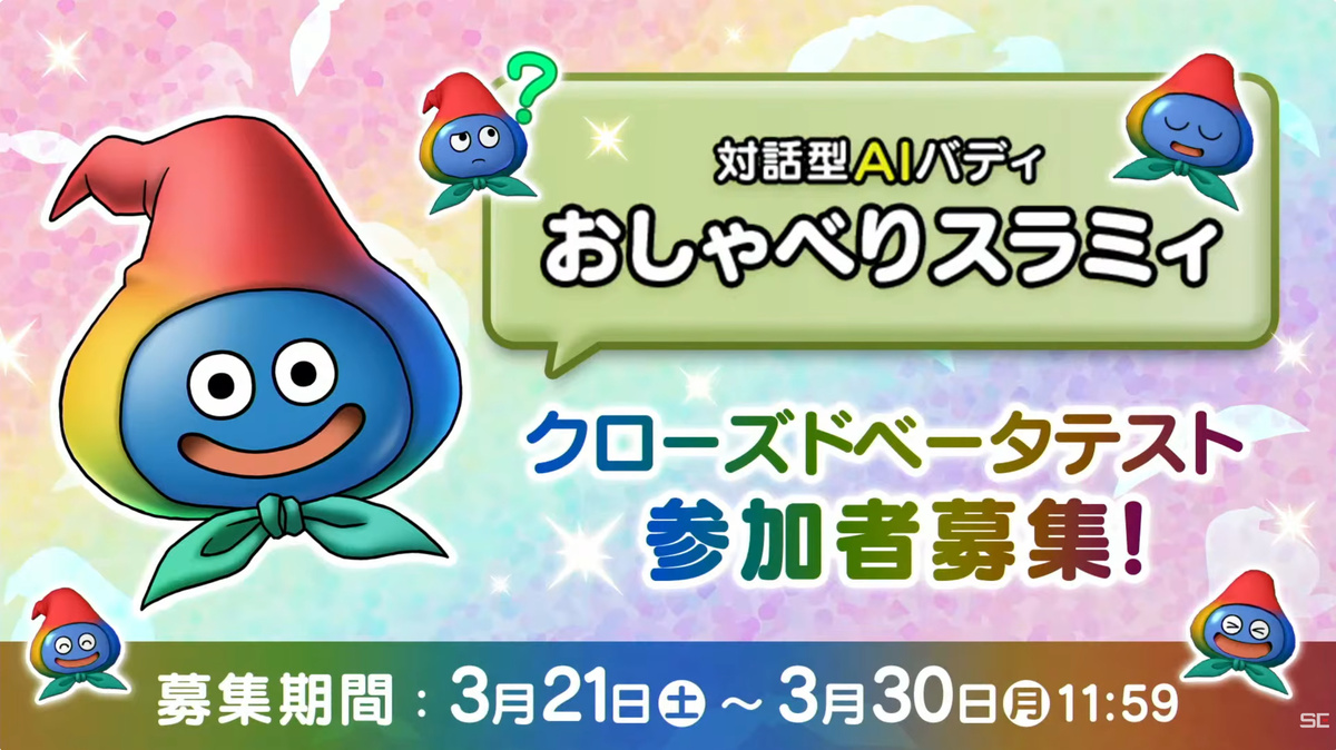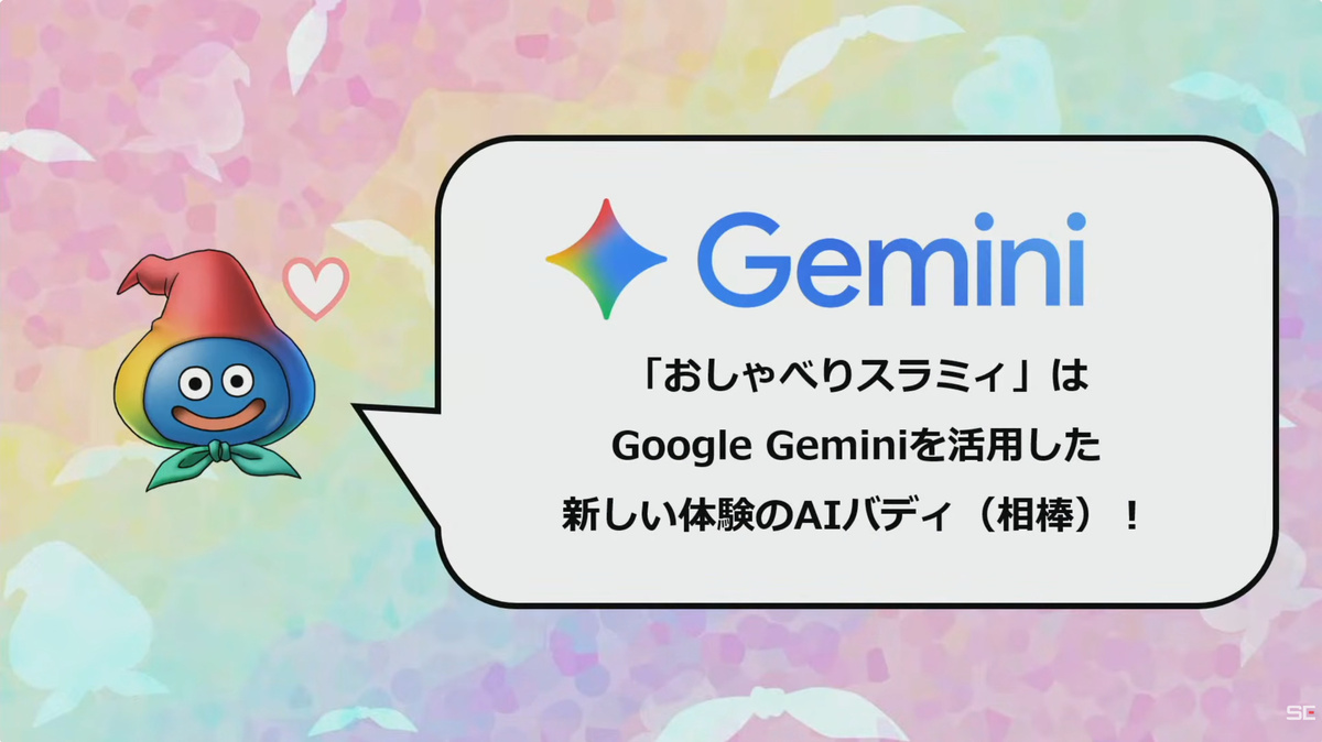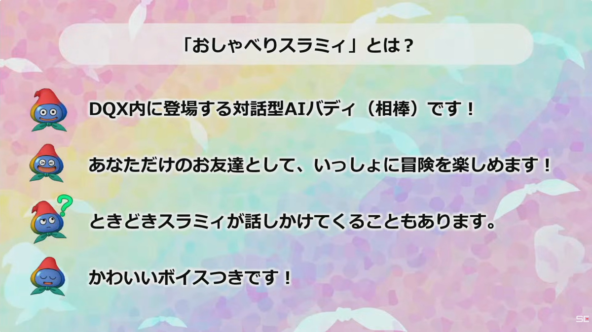 スクウェア・エニックスは3月21日、MMORPG「ドラゴンクエストX オンライン」にてGoogle Cloudと提携した新しい仕組み、対話型AI「おしゃべりスラミィ」を開発中だと発表した。