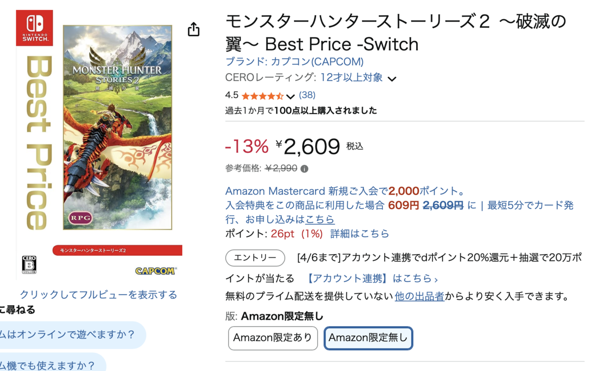 そのため、今回紹介するのは最新作の“3”ではなく前作の“2”。「モンスターハンターストーリーズ2 ~破滅の翼~ Best Price」です。Amazonでは参考価格が2,990円のところ、13%オフの2,609円で購入できます(3月23日現在)。