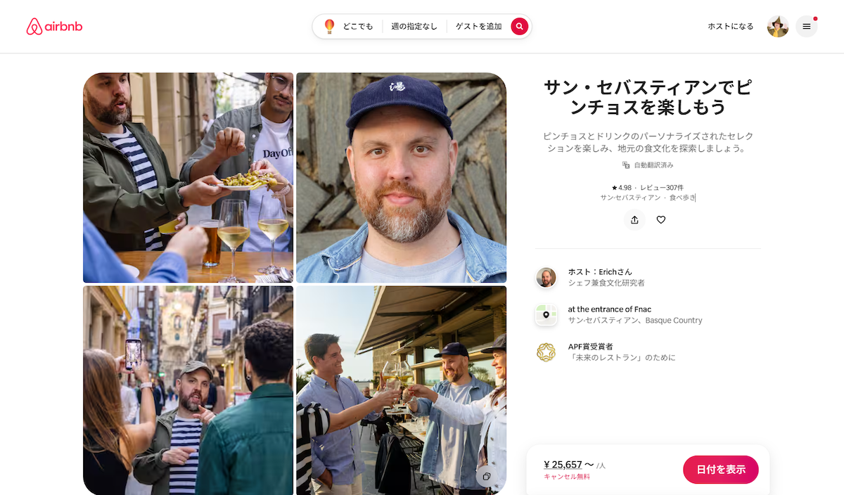 これまではインターネットの情報を頼りに自力でバル巡り(バルホッピング)を楽しんでいましたが、今回は少し視点を変えて、Airbnbの提供で体験ツアー「サンセバスティアンでピンチョスを楽しもう」(約2万5000円前後)に参加してみました。結果から言うと、これが大正解。自力だけでは絶対にたどり着けない、圧倒的な食体験でした。