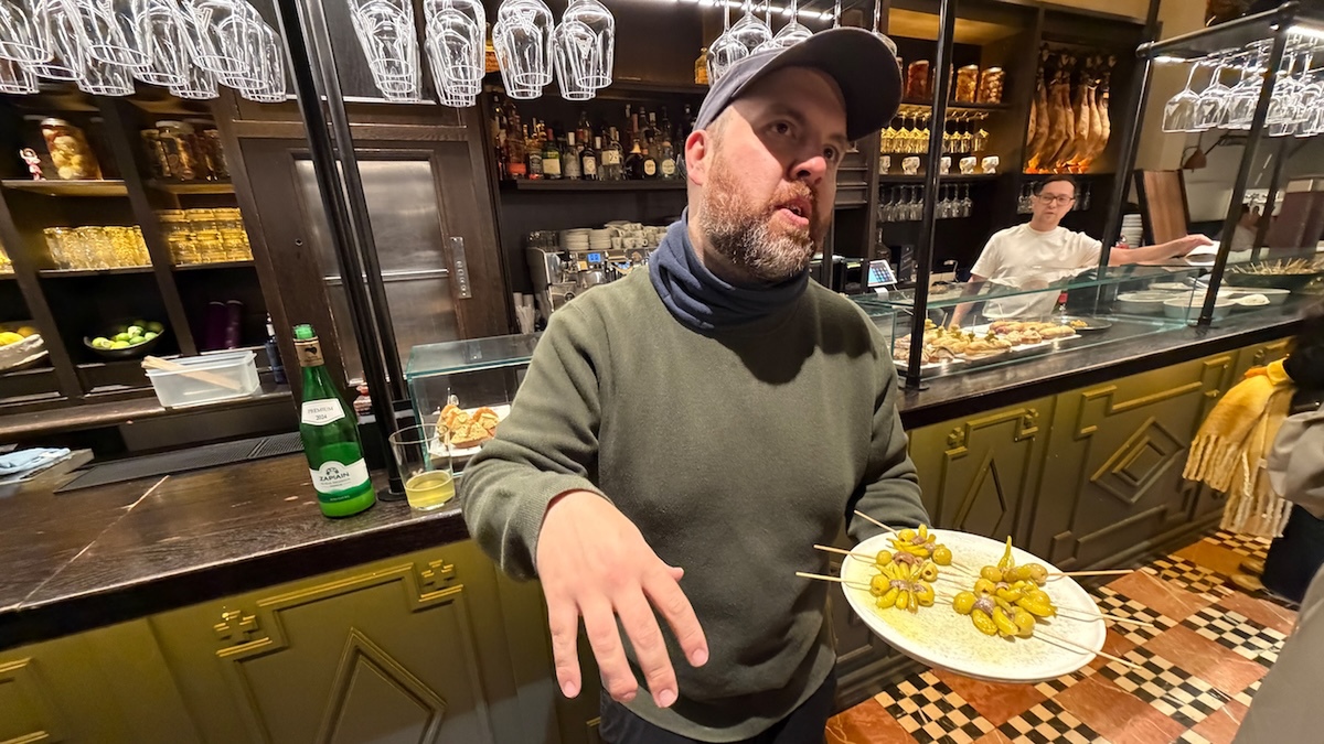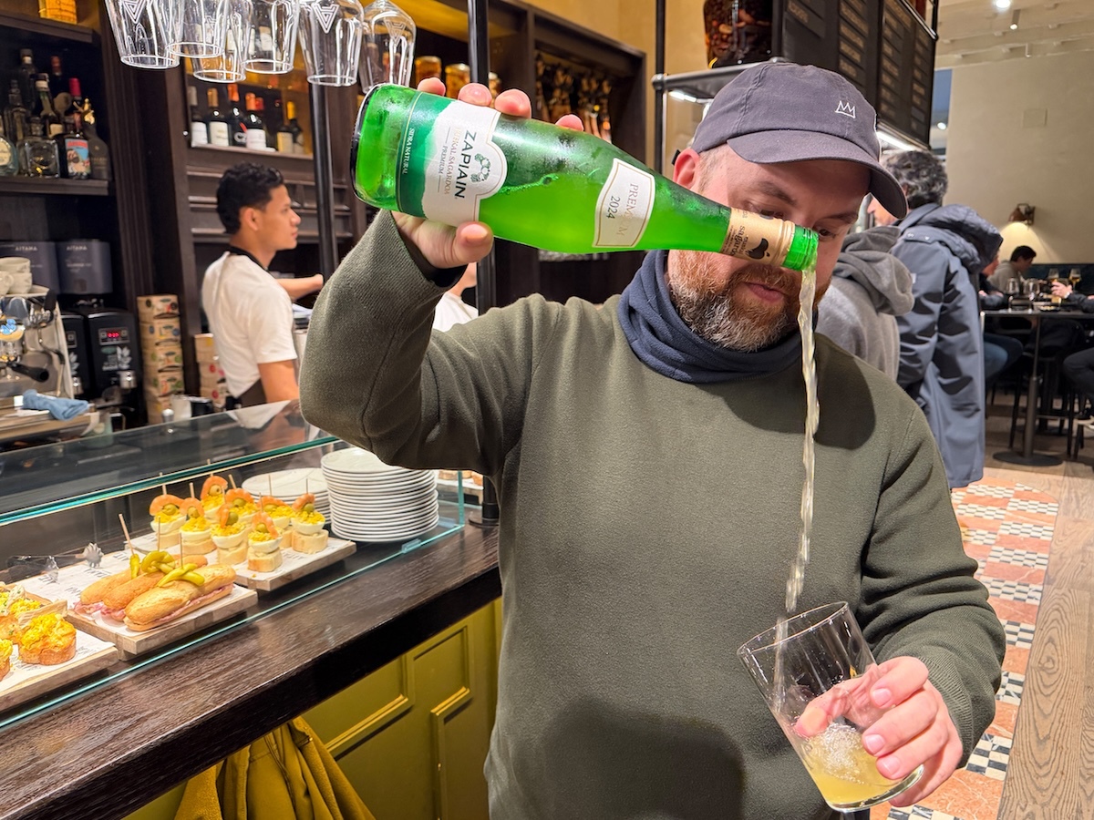 歴史を学びながら回った5軒のバルも最高でした。記念すべき1軒目の「Aitana Donostia」では、バスク名物のアップルサイダー(シードラ)で乾杯。エリックさんによれば、サンセバスティアンの街ができたのは1100年代後半ですが、リンゴの木はそれよりも何世紀も前からこの地にあり歴史深い飲み物とのこと。現地にはシードラハウス(リンゴ酒の醸造所)があり、樽から直接シードラを注いで飲み放題で楽しむ独自の文化があることも教えてくれました。(地図:Aitana Donostia)