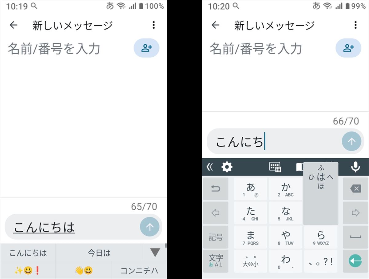 日本語入力にはオムロンデジタルの「iWnn IME for Android」が用いられている。物理キーで入力する場合は左の画面のように表示される。画面をタップすると、ソフトウェアキーボードが表示され、タッチで入力できる