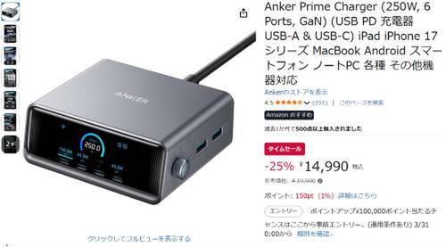 Ankerの高出力充電器「Anker Prime Charger(250W, 6 Ports, GaN)」がAmazonでタイムセール対象。参考価格19,990円のところ、25%オフの14,990円で販売中。