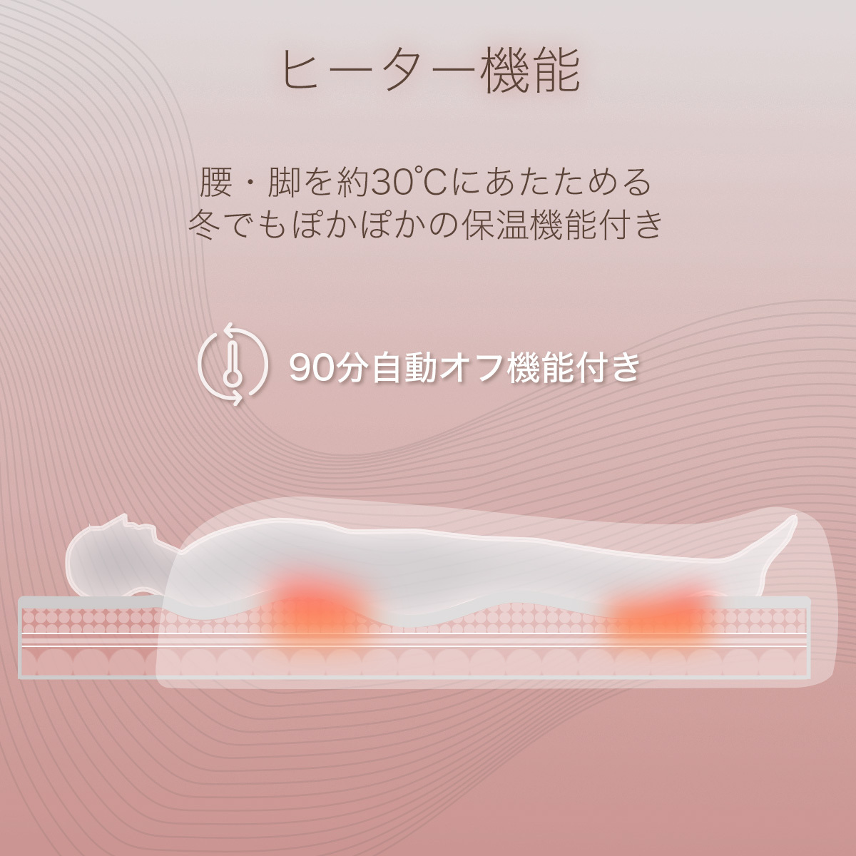 冷え性の人はとくに感じる、冬の冷え切った布団に入るあの「ヒヤッ」とする瞬間、辛いですよね。このAIマットレスには、そんな不快感を一掃する「ヒーター機能」が搭載されています。人が心地よいと感じる約30度を目安に、腰から下をじんわりと温めてくれるんです。