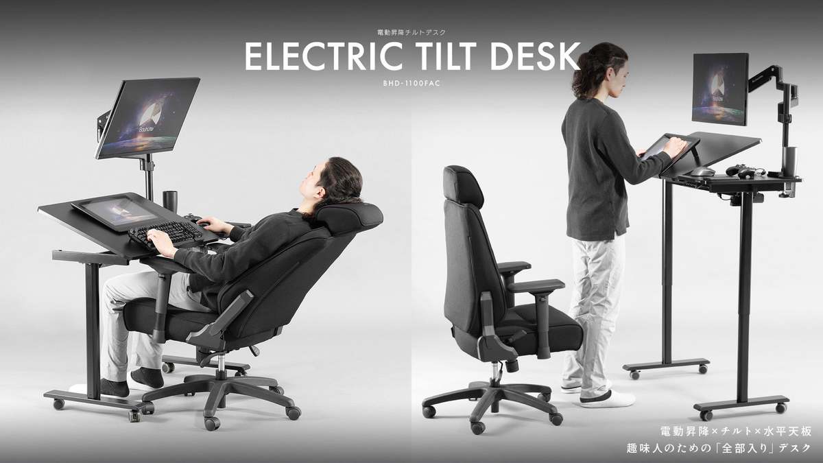 「電動昇降チルトデスク BHD-1100FAC」は、ゲーマーからデザイナーまで多様な活動をサポートするため、110cm幅のコンパクトさに多機能を詰め込んだ製品だ。右側の固定水平天板と65cm幅の可動チルト部を持つハイブリッド天板は、最大40°の無段階チルトを実現。この特設によって、液晶ペンタブレットによる描画やキーボード操作の快適性を高めている。さらに、ガスシリンダー方式の角度調節機能により、液タブを載せたままでも軽い力で利用可能だ。