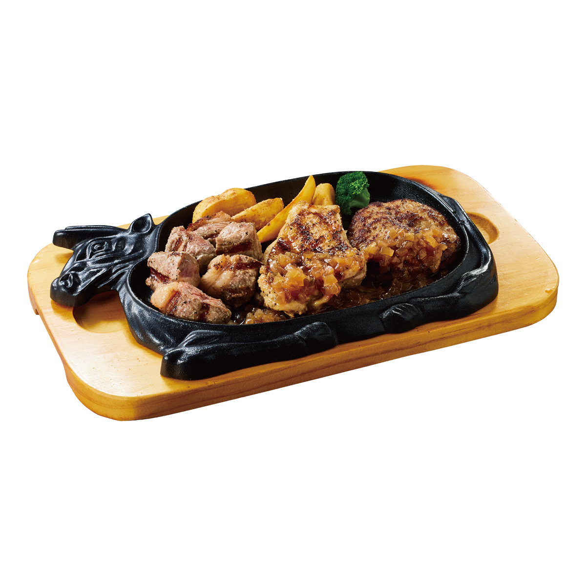 アンガスサーロインカット120gに加え、グリルチキン100gと手ごねハンバーグ100gを組み合わせたメニューです。