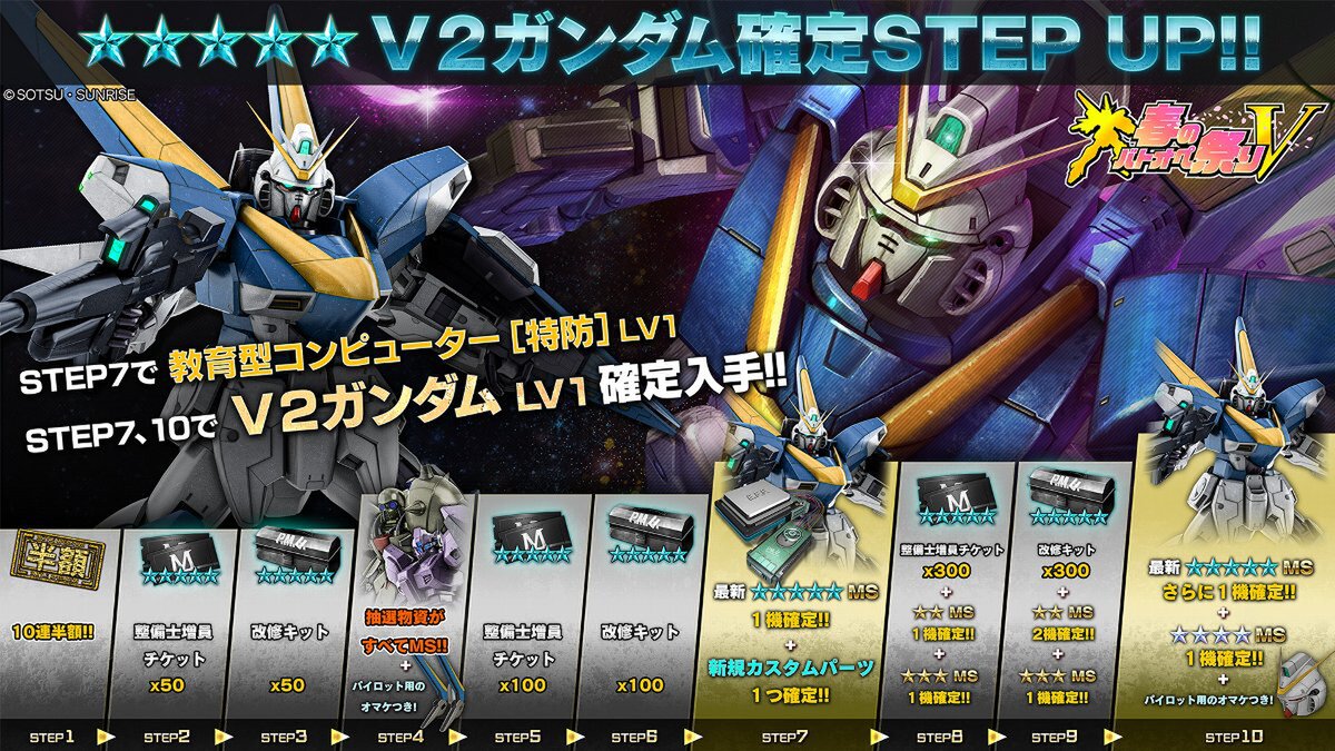 キャンペーン期間中は新機体「V2ガンダム」の登場や、おまけでカスタムパーツが手に入る毎週1回10連無料スペシャル抽選配給、<VRオペレーター>ウッソ付きトークンパックの販売など盛りだくさんなイベント内容となっている。