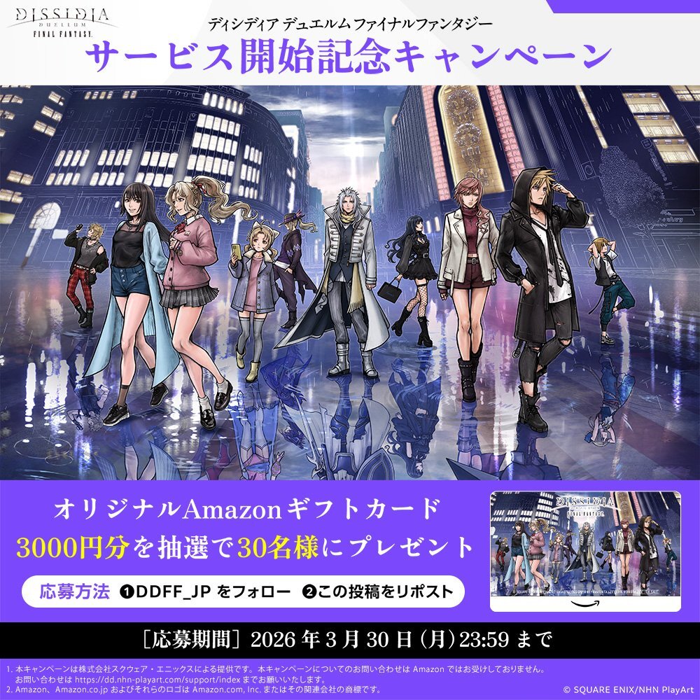サービス開始を記念してプレゼントキャンペーンを開催。『ディシディア デュエルム ファイナルファンタジー』公式Xアカウント(@DDFF_JP)をフォローして、応募期間までに対象の投稿をリポストした人の中から抽選で30名に、オリジナルAmazonギフトカードをプレゼント。応募期間は、2026年3月24日~3月30日23時59分まで。