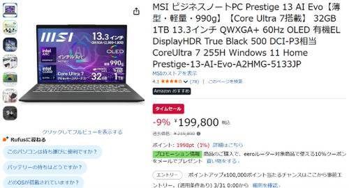MSIの13.3型ビジネスノートPC「Prestige 13 AI Evo(A2HMG-5133JP)」がAmazonタイムセール対象。過去価格21万9800円のところ、9%オフの19万9800円で販売中。