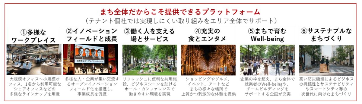 そのために、丸の内が135年にわたるまちづくりで築き上げた「利便性と集積」を最大限に活かして、テナント企業が、自社オフィスだけ、個社だけでは実現が難しいことを、街のサービスやイベント、交流の仕組みなども含めて、エリア全体「まちまるごと」でサポートしていこうという考え方を示した言葉が、“まちまるごとワークプレイス”構想なんです」