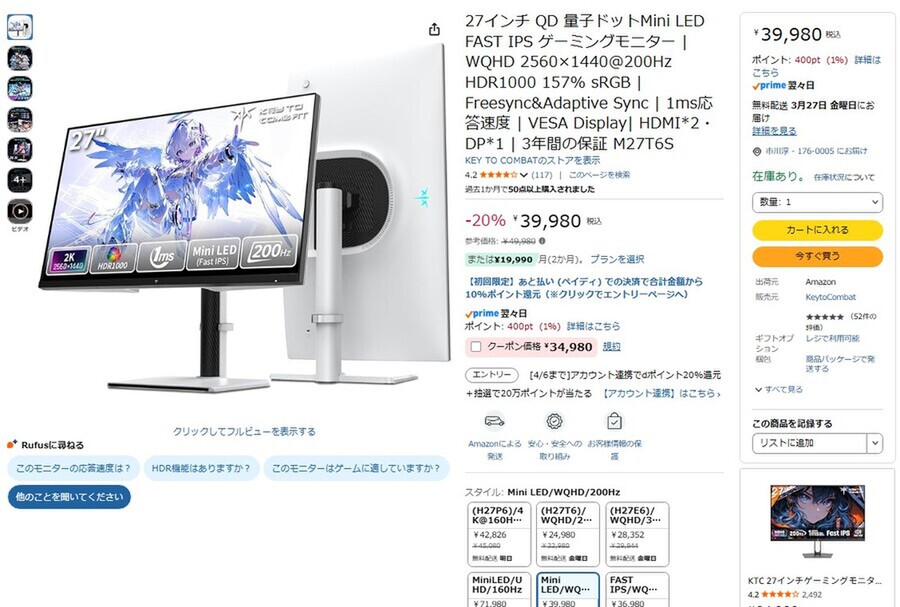 Amazon.co.jpにて、KTCの27型ゲーミングディスプレー「M27T6S」が販売中だ。参考価格は4万9980円だが、執筆時点では20%オフの3万9980円、クーポンを適用すると5000円オフの3万4980円で購入できる(3月25日)。