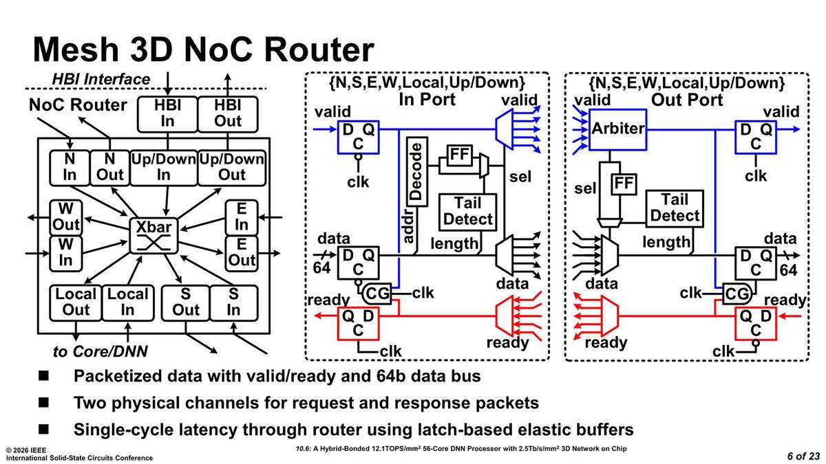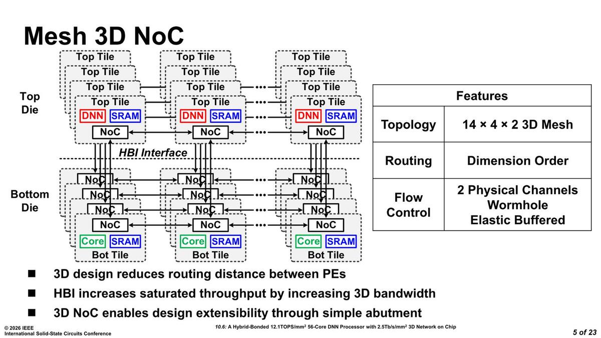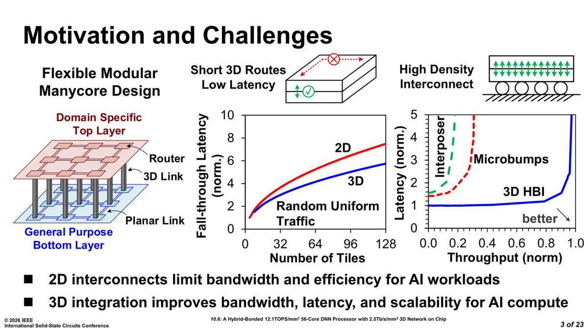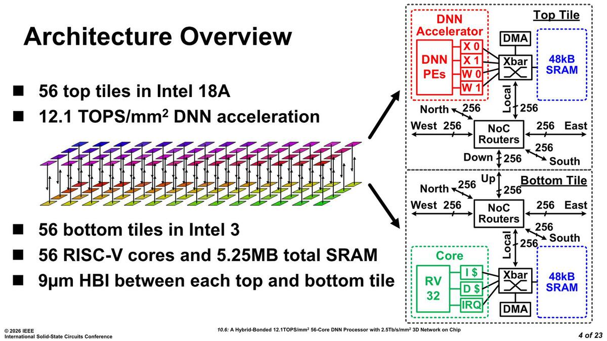 解決案はあって、ComputationとSRAMを別々のダイで製造し、3D実装すればいい。これを実行してしまったのが、インテルがISSCC 2026のPaper 10.6で"A Hybrid-Bonded 12.1 TOPS/mm 56-Core DNN Processor with 2.5Tb/s/mm2 3D Network on Chip"として発表した内容になる。