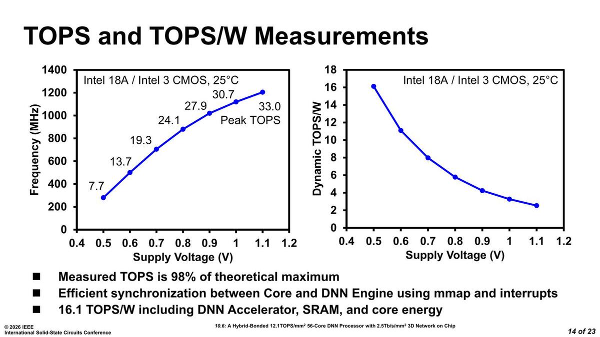 それとこのシステムの性能であるが、ピーク性能では1.2GHz駆動で33TOPSを記録するが、電圧も1.1Vと高めである。逆に電圧を下げると効率は16.1 TOPS/Wまで向上することが確認されたとする。