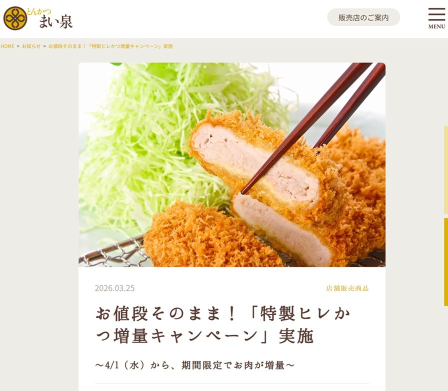 「とんかつ まい泉」は4月1日~12日の期間、「特製ヒレかつ増量キャンペーン」を全国直営店にて実施します。
