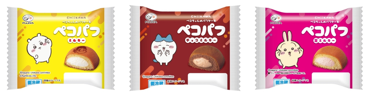 ふわふわの生地にミルキー風味のクリームを詰めた洋生菓子です。ミルキー(ちいかわ)、チョコミルキー(ハチワレ)、苺ミルキー(うさぎ)の3種類を展開します。