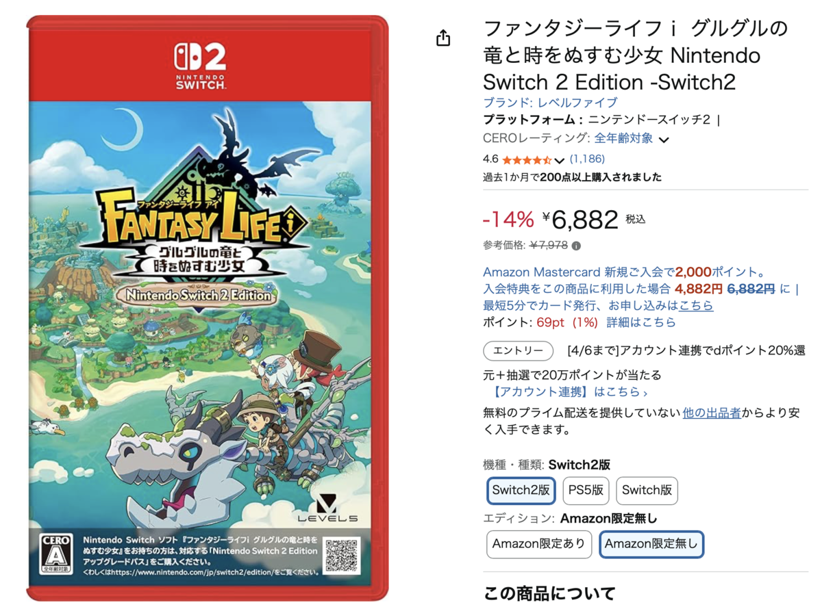 そんなスローライフも冒険も楽しめるRPGとして、私がオススメしたいのは「ファンタジーライフi グルグルの竜と時をぬすむ少女」です。Switch 2版の参考価格は7,978円ですが、Amazonでは14%オフの6,882円(3月25日現在)。ちなみに、PS5版もSwitch版もありますよ。