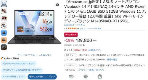 ASUSの14型ノートPC「Vivobook 14(M1405NAQ)」がAmazonタイムセール対象。参考価格109,800円のところ、18%オフの89,800円で販売中。