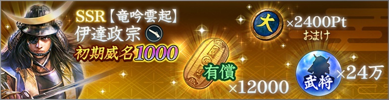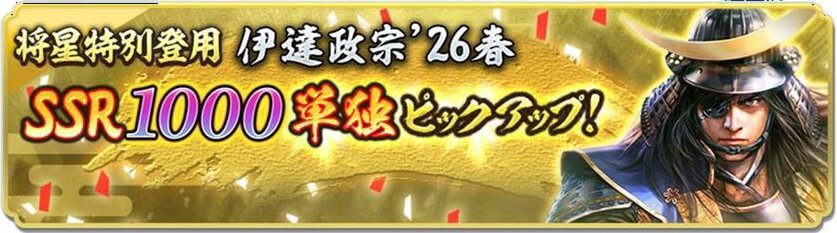 「将星特別登用・伊達政宗 '26春」を開催。初期威名1000のSSR【竜吟雲起】伊達政宗が単独ピックアップされる。