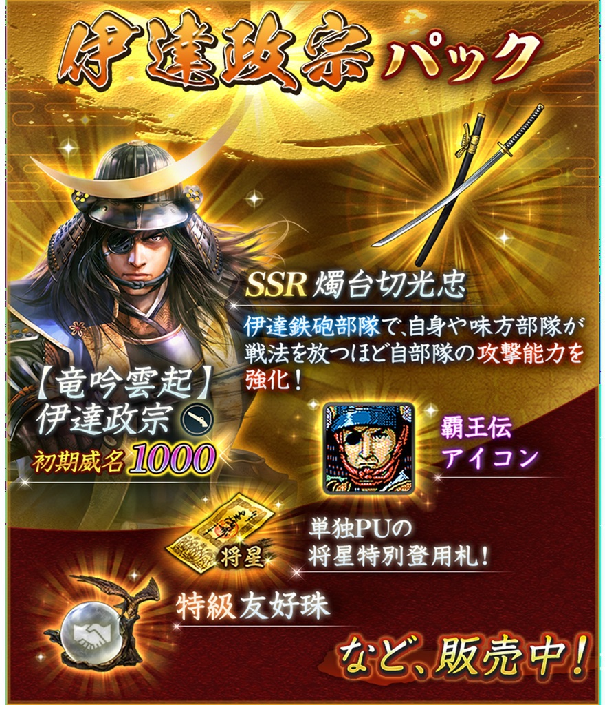 開催期間中、SSR【竜吟雲起】伊達政宗を覚醒ランク1にすると武将覚醒パックが最大12時間限定で販売される。詳細はゲーム内で確認のこと。