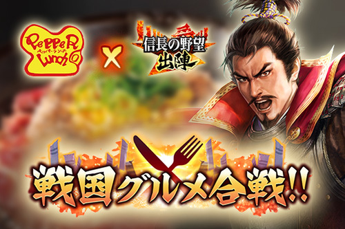 ペッパーランチ店舗で、『信長の野望 出陣』コラボメニューが第1弾から第3弾まで販売。織田信長、豊臣秀吉、徳川家康のゆかりの地にちなんだ食材を使用した3種のペッパーライスが登場する。