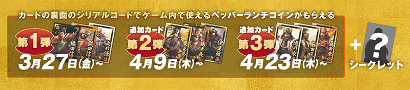 コラボメニューを注文すると、『信長の野望 出陣』オリジナル武将カードを獲得できる。武将カードの裏面にはシリアルコードが記載されており、案内にしたがってシリアルコードを入力するとペッパーランチコイン×150を獲得できる。