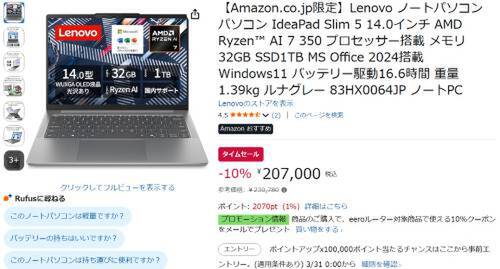 Lenovoの14型ノートPC「IdeaPad Slim 5(83HX0064JP)」がAmazonタイムセール対象。参考価格230,780円のところ、10%オフの207,000円で販売中。